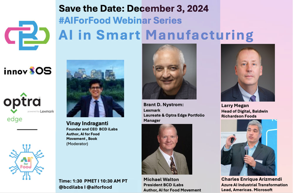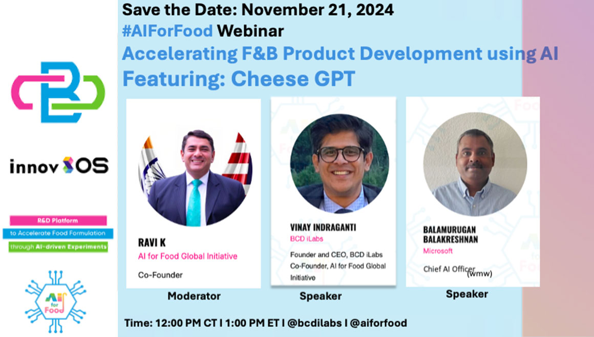 A groundbreaking webinar on Accelerating F&B Product Development using AI! Cheese GPT, the future of food creation, is here! Discover how this revolutionary AI is transforming how we develop delicious and innovative F&B products. Learn from industry leaders: Balamurugan Balakreshnan (Chief AI Officer, WMW) will share insider knowledge, while Vinay Indraganti (Founder & CEO of BCD iLabs, Co-founder of The AI For Food Global Initiative, Author of "The AI For Food Movement") dives deep into the world of AI for Food. Moderated by Ravi K (Co-founder, AI For Food Global Movement, Author of "AI for Food Movement"), gain insights from a leading voice. This webinar is packed with insights to revolutionize your F&B product development, unlock creative possibilities, and stay ahead of the curve. Don't miss out!